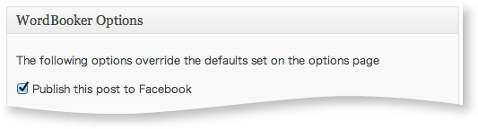 一つ注意が必要だったのはオプションの設定。書いたそばから公開するならいいのですが、時間を指定しての予約投稿をfacebookに流すには、ダッシュボードのWordbookerの設定項目だけでなく、投稿編集画面の下に現れる「Publish this post to Facebook」にチェックを入れておく必要があるようです。